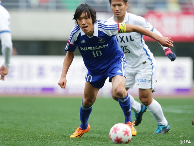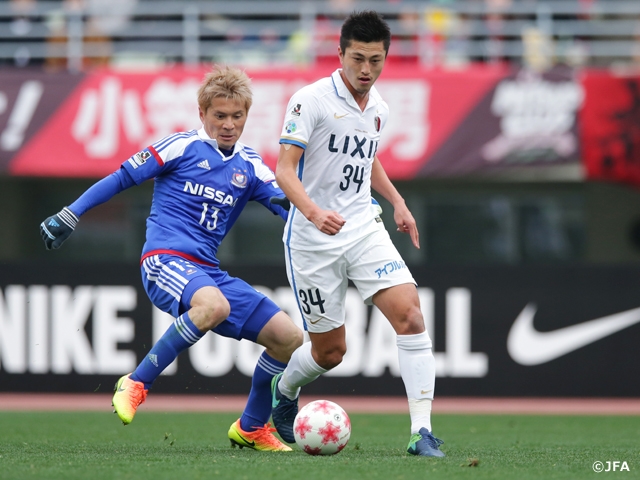 立ち上がりにチャンスをつくったのは、横浜FMでした。突破力に秀でた両サイドから鹿島陣内へ攻め込むと、6分には左サイドでボールを受けた齋藤学選手がドリブルで中央に切れ込み、シュートを狙いましたが、枠を捕らえることができません。34分にも齋藤選手が決定機を演出します。自らが出したパスのリターンをペナルティーエリア左で受け直すと、GKをかわしてゴール前へパスを供給。最後は前田直輝選手がゴールを狙いましたが、山本脩斗選手の体を張った守備に阻まれます。