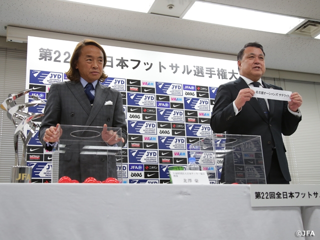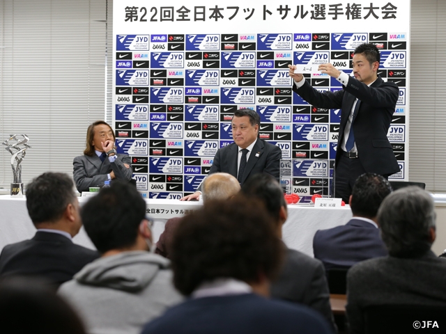 日本サッカー協会(JFA)は2月1日(水)、第22回全日本フットサル選手権大会の組み合わせ抽選会を行いました。田嶋幸三JFA会長、北澤豪JFA理事、元フットサル日本代表の北原亘さんがドロワーとして登壇しました。
