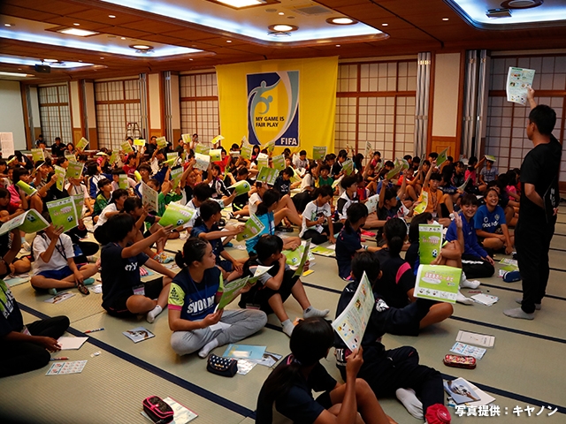 試合終了後は、選手、指導者がパノラマランド木島平に集まり、大会協賛社のキヤノン株式会社、ホクト株式会社によるワークショップが開かれました。キヤノン株式会社からは、写真や映像を通した人と人のコミュニケーションの大切さについて、ホクト株式会社からは丈夫で強い体をつくるための食事の大切さについて教わることができました。