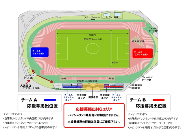 サポーターエリア(メイン1・3ゲート外側各3ブロックの座席)において、以下行為を禁止します。