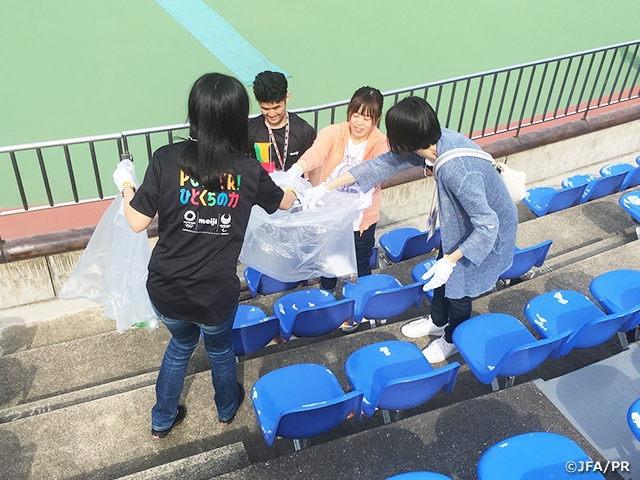 試合終了後にサポーター退出後、現地スタッフと共にスタジアム清掃を行いました。