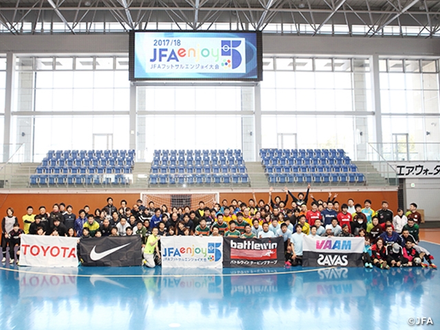 2018/19 JFAエンジョイ5は、すべての人にフットサルの楽しさを届けたい。そんな想いのもと、JFAが開催するエンジョイ志向のフットサルプレーヤーを対象とした全国大会です。フットサルの楽しさを、仲間とともにプレーする喜びを、そしてゴールを共有する感動と興奮を。日本各地たくさんのプレーヤーへ広げていきます。