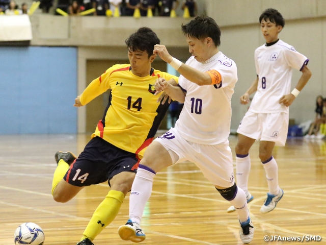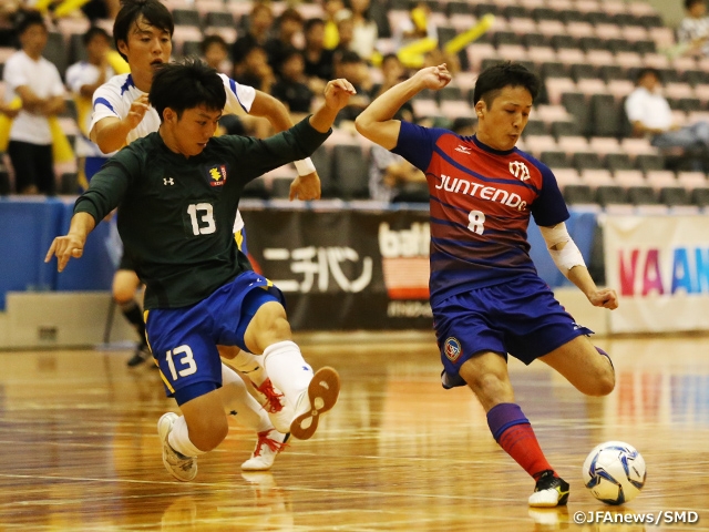 過去2大会の決勝と同じカードになった、大阪成蹊大学フットサル部(開催地/大阪)と順天堂大学フットサル部ガジル/ジェイエフシー(関東1/千葉)の試合は、劇的な試合展開となります。7分に相手のパス回しのミスを逃さなかった大阪成蹊大は、中井駿斗選手がショートカウンターから先制点を挙げます。しかし、順天堂大も前半のうちに同点に追いつくと、後半残り5分で赤堀海地選手が逆転ゴールを決め、リードを奪いました。このまま試合が終わるかと思われた残り11秒、大阪成蹊大はGKの橋野司選手が攻撃参加すると、強烈なシュートを順天堂大ゴールにたたき込み、土壇場で同点に追いつきます。この流れに乗りたい大阪成蹊大でしたが、PK戦では思い切り蹴ったシュートが2本、クロスバーを越えるなど、決定力を欠いてしまいます。結局、4人目までもつれたPK戦を2-1で制した順天堂大が、3大会連続で大阪成蹊大を破りました。