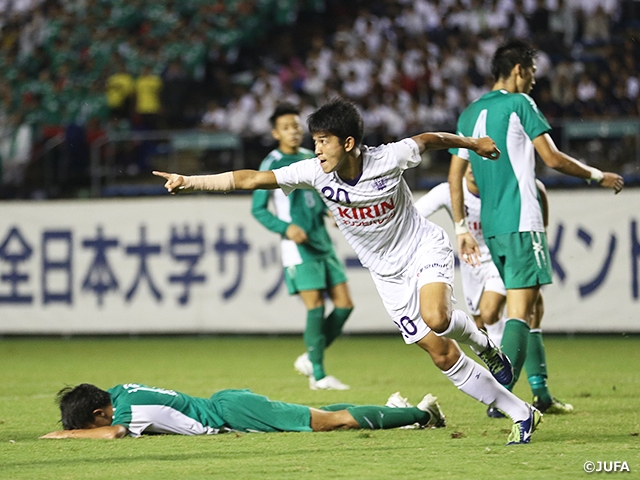 試合は立ち上がり、大阪体育大学が優勢に試合を進めます。「今大会ではいちばん高い位置でボールを奪えていた」と松尾元太監督が振り返るように、林大地選手と古城優選手の2トップが前線でボールを収め、幾度となくチャンスを作りますが、ゴールを決めることができません。すると次第に明治大学が大阪体育大学のディフェンスの裏を狙った攻撃で反撃し、試合は一進一退の状況に。このまま無得点で折り返すかと思われた41分、明治大学は右サイドバックの中村帆高選手から攻撃を仕掛け、狩土名禅選手がパスをつなぐと前線に上がってきたボランチの安部柊斗選手がシュートを放ちます。このシュートは相手DFに跳ね返されるものの、こぼれ球を再び安部選手が左足で突き刺しゴール。安部選手の2試合連続ゴールで明治大学が先制します。