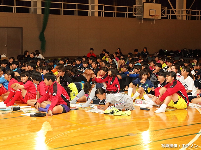 試合終了後は小樽市立望洋台中学校へ移動し、選手を対象にホクト株式会社による食育セミナーやキヤノン株式会社によるVTR上映、JFAナショナルトレセンコーチによるリスペクトワークショップが行われました。食事の後には指導者研修会が開催され、大会のあり方についての意見交換や、女子トレセンの活動についての情報交換が行われました。