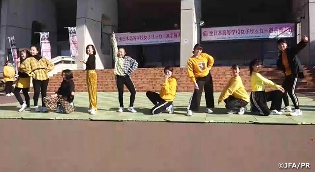 高等学校女子サッカーの決勝という、大きな試合で演技をさせていただけたことに、部員一同心より感謝しております。この試合で演技ができると決まったとき、部員は大歓声を上げて、全員で大喜びでした。その日から新たに士気を高め、この演技に向けた練習がスタートしました。今回は‘ダンス’に力を入れた演技です。選抜されたメンバーで、何度も何度も躍り込み、練習を重ねました。顔の向きや目線、手先の形や角度など、細部にこだわりを持ち、時間をかけて魅力ある‘ダンス’が完成しました。本番演技はミスなく終えることができ、私たちの中では満足できる演技ができたと思います。試合会場は、開始前やハーフタイム中も、絶やさず応援されている観客の方々の声援で、終始大盛り上がりでした。観客の方々の声援に後押しされながら、最大限に力を出し切り、演技ができました。観客の方々と一体となって会場を盛り上げられたことがとても嬉しいです。選手たちに演技を通してパワーを届けられていれば幸いです。大変貴重な経験をさせていただきまして、本当にありがとうございました。