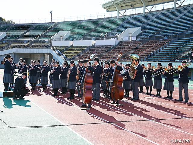 大変貴重な機会をいただいたことを心より感謝申し上げます。決勝戦の式典演奏ということで、華やかさと緊張感をもった演奏ができるよう練習に取り組みました。冬の屋外演奏は慣れないことが多く、コンディションを保つのにも苦労しましたが、スタッフの皆さんのサポートもあって楽しんで臨むことができました。