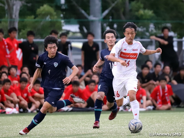 前半はシュート1本に終わった東福岡はハーフタイムに攻撃を2枚替え、「後ろでのボール回しだけじゃなく、自分が前に出てセカンドボールを拾ったり、高い位置での起点になろうと考えた」MF荒木遼太郎選手(#10)を中心に反撃に出ます。61分にはMF佐藤聡史選手(#16)のパスから荒木選手が決定機を迎えましたが、GKがブロック。以降も、「このチームの強み」と井上監督が胸を張るMF吉村銀河選手(#7)らに要所を封じられ、同点弾が奪えません。