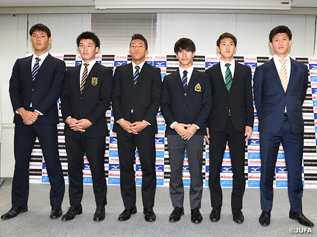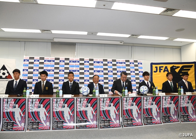 会見には日本サッカー協会の田嶋幸三会長、全日本大学サッカー連盟の中野雄二技術委員長、そして出場大学を代表して明治大学の佐藤亮選手、桐蔭横浜大学のイサカゼイン選手、立正大学の人見拓哉選手、法政大学の加藤威吹樹選手、中央大学の加藤陸次樹選手、筑波大学の山川哲史選手が登壇し、大会の見どころや意気込みなどを語りました。