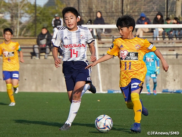 ラウンド16ではベガルタ仙台ジュニア(宮城)と横浜F・マリノスプライマリー(神奈川)のJクラブのアカデミー同士が対戦。前半を1-1で折り返すと、後半は横浜FMがピッチを広く使ってボールを運び、仙台もゴール前に人数を掛けてゴールを狙います。試合は38分、仙台の野川一聡選手が相手を引き寄せながら巧みにパスを出し、反応した佐々木亮選手が勝ち越し点となるシュート。このゴールで勝利した仙台がベスト8入りを決めました。