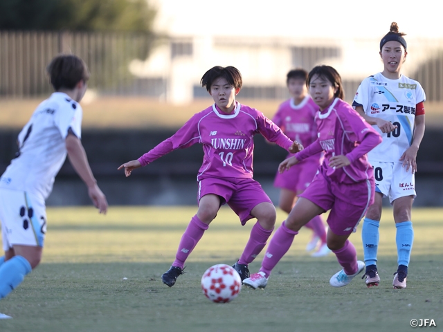 なでしこ1部でチーム史上最高の3位となったASハリマアルビオン(なでしこ1部/兵庫)と、5度の全日本高等学校女子サッカー選手権大会優勝経験を持つ藤枝順心高校(東海2/静岡)の一戦は、激しい得点の奪い合いとなりました。