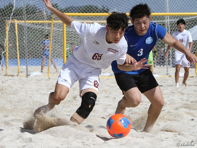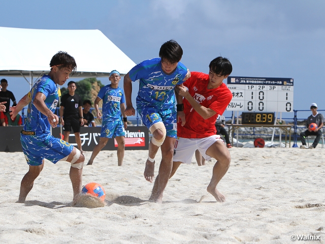 JFA 第19回全日本ビーチサッカー大会が10月18日(金)、沖縄県国頭郡金武町のKINサンライズビーチ海浜公園で開幕しました。大会初日は1回戦を行い、全16チームがベスト8進出を目指して熱闘を繰り広げました。