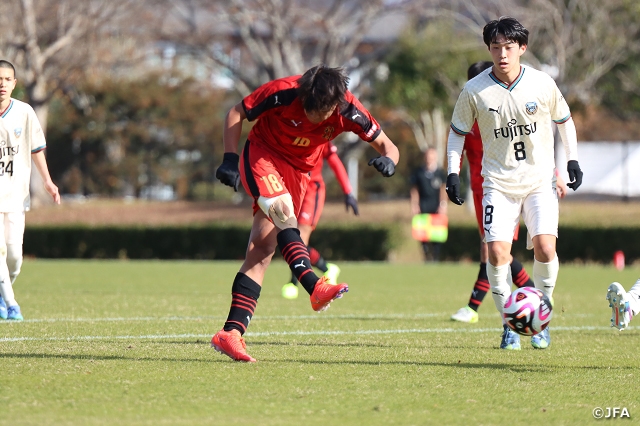 山口県維新百年記念公園 ラグビー・サッカー場の第1試合では、第39回日本クラブユースサッカー選手権(U-15)大会の王者・川崎フロンターレU-15生田(関東4/神奈川)と、令和6年度 全国中学校体育大会 第55回全国中学校サッカー大会を制した神村学園中等部(九州2/鹿児島)の対決が実現しました。