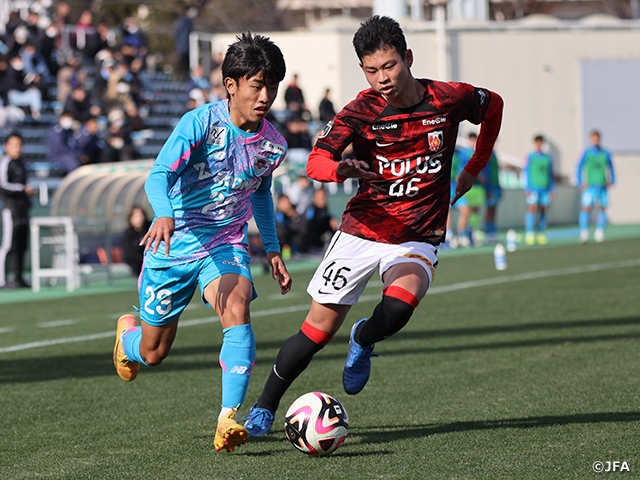 第1試合は立ち上がりから浦和レッズジュニアユース(関東7/埼玉)が見せ場をつくりました。「相手は守備がコンパクトなチームだったので、サイドから攻めることを意識していた」と話す岩﨑篤斗選手は、センターバックでコンビを組む松坂碧生選手同様、ボールを持ったらサイドにロングボールを展開。左サイドの笠間遼世選手が仕掛け、サガン鳥栖U-15(九州3/佐賀)を押し込ましたが、GK梅崎正基選手の牙城を崩せず、スコアレスのまま前半を終えました。