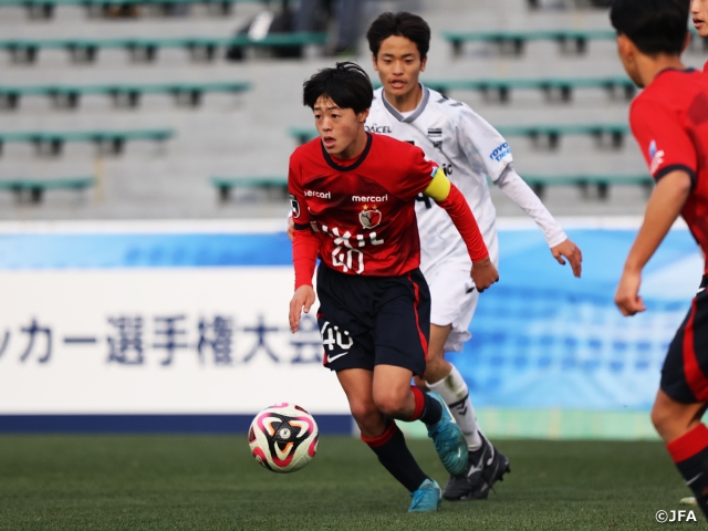 前年度の王者・鹿島は、一人少ない状況ながらも後半に意地を見せます。43分、礒部怜夢選手が奪ったPKを髙木瑛人選手が決めて1点を返します。対するG大阪はその6分後、川野聖選手が得点し、再び3点差とします。後半は守備に回る時間が増えたG大阪ですが、積極的に交代のカードを切って攻撃を活性化させると、59分に加賀野統選手、68分には坂井雄真選手が決めて勝利をたぐり寄せます。攻撃の手を緩めなかったG大阪が鹿島を振り切り、決勝に駒を進めました。