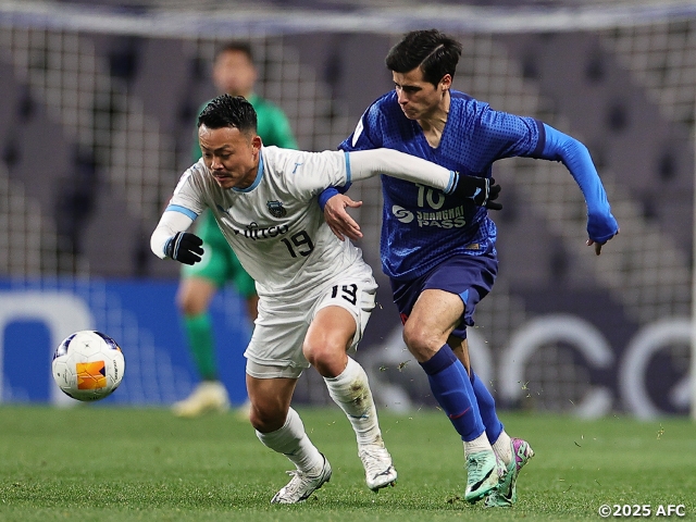 川崎と上海申花は昨年10月のリーグステージでも対戦し、ホームの上海申花が2-0で勝利。今回、雪辱を期して臨んだ川崎は、前半33分に高い位置で相手にプレッシャーをかけてボールを奪い、素早い切り替えから脇坂泰斗選手がゴールネットを揺らします。しかしこれはVARでオフサイドの判定となりノーゴールに。前半40分過ぎには、河原創選手が脇坂選手とのワン・ツーパスから上げたクロスにマルシーニョ選手が左足で狙いましたが、枠を捉えることができません。