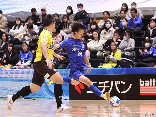 第2試合と第3試合は、東京勢同士の対戦となりました。ペスカドーラ町田(F1/東京)と立川アスレティックFC(F1/東京)の一戦は、強度の高い内容になりました。序盤に両チームが1点ずつを取り合うと、17分には町田のアカデミーで育ち、現在は立川の中心選手となっている中村充選手がカウンターから追加点を挙げます。1点リードのまま迎えた第2ピリオドでも立川はゴールを重ね、中村選手はハットトリックを達成。最終的には5-1で立川が準決勝に勝ち上がりました。