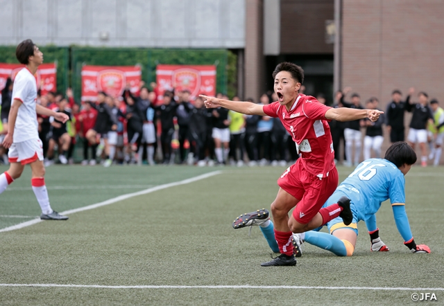 エンドが変わった後半も互いに攻める展開が続く中、64分には東福岡の冨安選手が前線にロングボールを入れると、反応したのはMF齊藤琉稀空選手(#10)。「ポストプレーでは仲間がうまく自分を使ってくれているので期待に応えないといけない。何があっても落とそうと意識していた」と話す通り名古屋のDFに競り勝ち、最後はこぼれ球を拾った吉川選手が右足でシュートを叩き込みました。