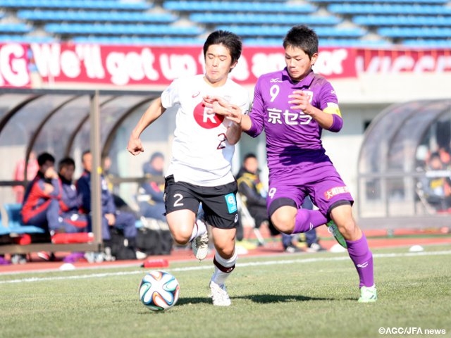 準決勝第1試合は、前回大会覇者の浦和レッズジュニアユース(関東4)を破った神戸と、準々決勝の横浜F・マリノスユース(関東3)戦でPK戦を制して勝ち上がってきた京都が対戦しました。試合は神戸が中盤でリズムをつくる展開で進んでいきます。15分には高い位置でボールを奪った渡邉一也選手からパスを受けた今岡陽太選手がゴールに流し込みますが、オフサイドの判定。その後も今岡選手を中心に攻め立てますが、京都も最後のところでゴールを許さず、試合は後半へと突入しました。