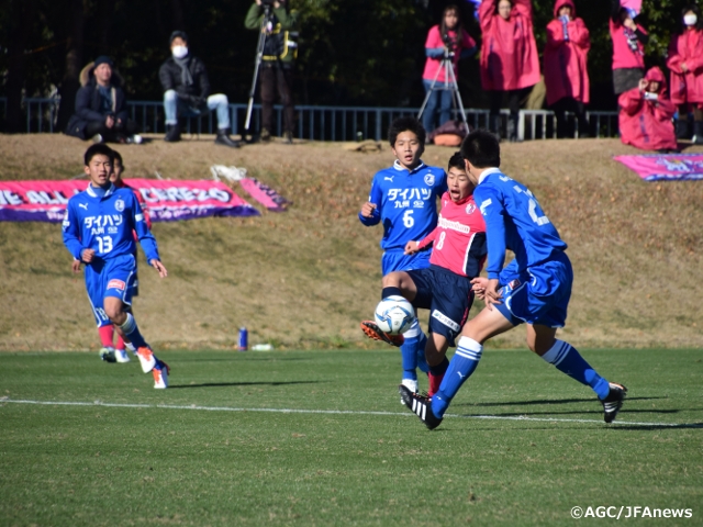 試合は、喜田陽選手や鈴木冬一選手などU-15日本代表候補を擁するC大阪が序盤から流れをつかみます。長短を織り交ぜたパスで大分ゴールに迫ると7分、谷本駿介選手のパスに抜け出した小松海樹選手がGKとの1対1を制し、先制に成功。これでリズムに乗ると、15分にはCB瀬古歩夢選手のフィードに鈴木選手が反応、相手GKをかわして無人のゴールに流し込み、リードを2点に広げます。
