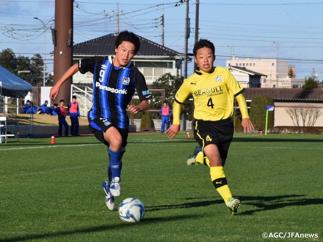 前回大会で準優勝したヴィッセル神戸U-15(関西5)もカターレ富山U-15(北信越3)、SSSジュニアユース(北海道2)を破って8強入りしましたが、ガンバ大阪ジュニアユース(関西3)との準々決勝に敗れ、昨年の雪辱を果たすことはできませんでした。G大阪はここまで、原田烈志選手が6得点、足立翼選手が4得点を挙げ、チームとしても3試合で13得点と圧倒的な強さをみせています。