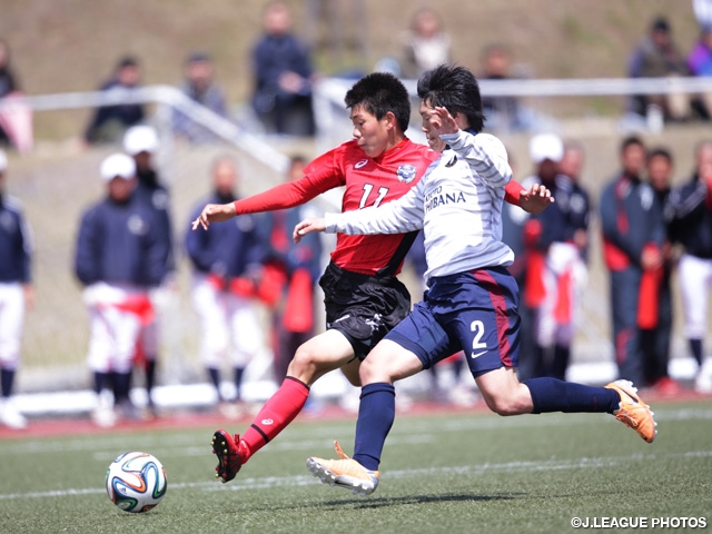 その他の会場では、名古屋グランパスU18(愛知)が桜井昴選手の2得点などで富山第一高校(富山)に3-1と快勝。2011年、12年の王者・サンフレッチェ広島F.Cユース(広島)は後半に3点を挙げ、逆転で京都サンガF.C. U-18(京都)を退けました。セレッソ大阪U-18(大阪)は唯一の九州勢・東福岡高校(福岡)との接戦の末、阪本将基選手の得点で1-0と勝利。J1リーグ、ガンバ大阪と鹿島アントラーズの試合後の開催となったガンバ大阪ユース(大阪)とヴィッセル神戸U-18(兵庫)の一戦は、昨年のWEST覇者・神戸が中坂勇哉選手、米澤令衣選手、永澤竜亮選手の得点でG大阪ユースを3-0で下し、連覇に向けて好発進しました。
