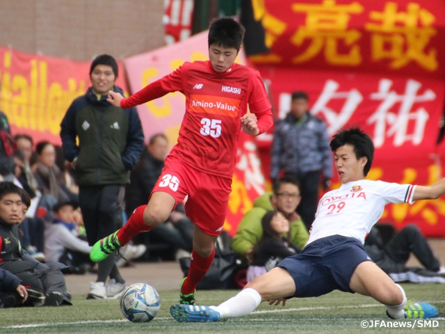 勝点3差で追う神戸弘陵学園高校(兵庫)の結果次第では、この試合に勝てば残留の可能性がある名古屋は、「この一戦に全てを懸けるつもりで一週間準備してきた」(菅原由勢選手)と試合開始からアグレッシブなプレーを披露。FWマツオカ・ジョナタン選手を中心にチャンスをつくりますが、ゴール前での迫力を欠き、前半のシュートは1本に終わります。対する東福岡も、「ボールは動いていたけれど、ゴールを目指せていなかった」と前島正弥選手が振り返ったようにフィニッシュまで持ち込むことができず、スコアレスのまま試合を折り返します。