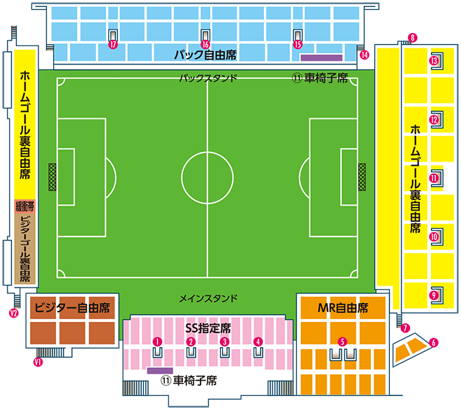 - 車椅子席をご利用の方につきましては、ゴール裏自由席チケットをお買い求めください。