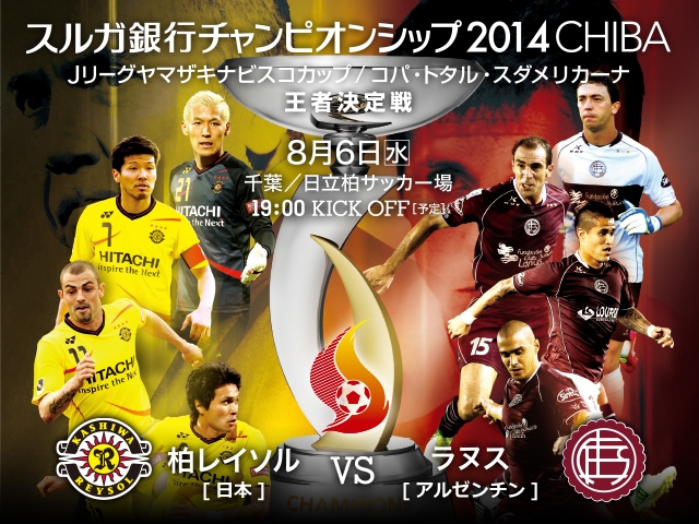 2013Jリーグヤマザキナビスコカップウィナーの柏レイソルと、南米の重要なクラブ選手権の一つであるコパ・トタル・スダメリカーナ2013 覇者のラヌス(アルゼンチン)が対戦する、「スルガ銀行チャンピオンシップ Jリーグヤマザキナビスコカップ/コパ・スダメリカーナ王者決定戦」を8月6日(水)に日立柏サッカー場(千葉県)で開催します。