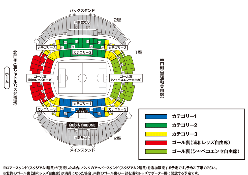 - 北側のゴール裏(浦和レッズ自由席)が満員になった場合、南側のゴール裏の一部を浦和レッズサポーター用に開放する予定です。
