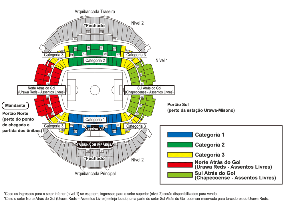 - Caso o setor Norte Atrás do Gol (Urawa Reds – Assentos Livres) esteja lotado, uma parte do setor Sul Atrás do Gol pode ser reservado para torcedores do Urawa Reds.