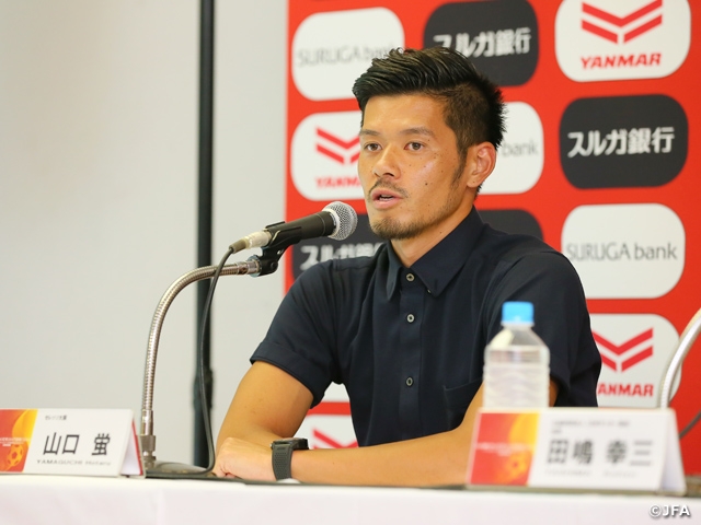 会見には公益財団法人日本サッカー協会の田嶋幸三会長と共に2017JリーグYBCルヴァンカップを制して大会の出場権を手にしたセレッソ大阪から尹晶煥監督とキャプテンの山口蛍選手が登壇。