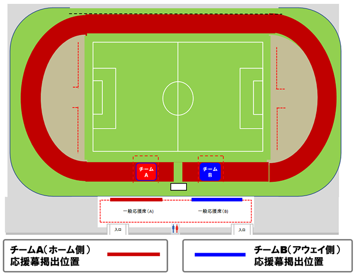※両ゴールの真後ろにつきましては、競技運営上支障をきたす恐れがあるため、応援幕の掲出はできません。