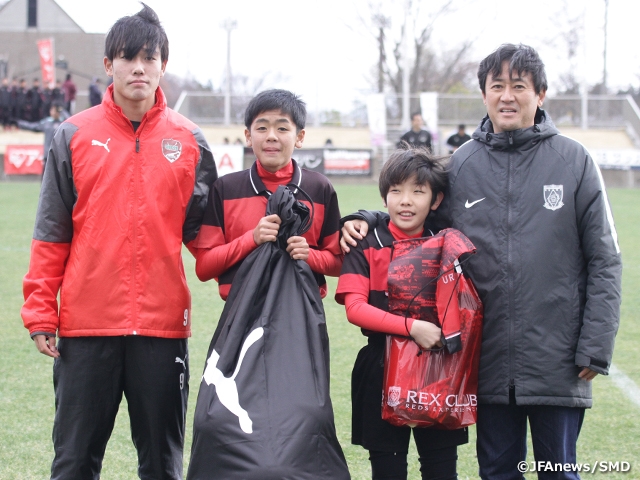 この試合に選手たちはエスコートキッズを伴って入場しました。「このリーグを通じて少しでも地域の皆さんに貢献したい」という仲村監督のアイデアで今季実施されており、この日は郡山市立赤木小学校のみなさんが選手と一緒に入場。また、赤木小学校は台風19号に伴う浸水被害により現在も厳しい状況にあるため、この機会に尚志と浦和の双方から、少しでも役に立ててほしいとサッカー用品などが贈られました。