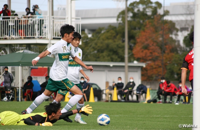 序盤から攻勢に出たのは静岡学園でした。ドリブルやショートパスを用いながらチーム全体で積極的に前へ出ます。ボールを奪われても、迫力あるプレッシングで名古屋の反撃を許しませんでした。12分にはやや距離があるFKをMF清水和馬選手(#6)が直接ゴール枠内へ飛ばしますが、これは名古屋GK東ジョン選手(#1)に弾き出されました。静岡学園は23分にもMF渡辺怜歩選手(#7)、DF小泉龍之介選手(#12)と連続して近距離からのシュートに持ち込みますが、この絶好機も名古屋GK東選手の好守に防がれました。