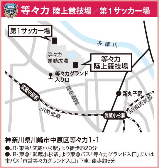 ●JR・東急「武蔵小杉駅」より東急バス「等々力グランド入口」または市バス「市営等々力グランド入口」下車、徒歩約5分