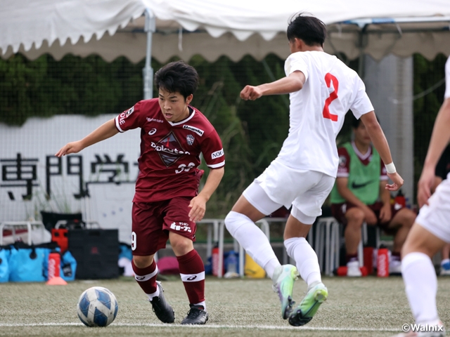 履正社茨木グラウンドで行われたヴィッセル神戸U-18(兵庫)との一戦は、インターハイ出場をつかんだ勢いのままゲームに挑みました。ボールを持ったら素早く前方にボールを入れて、FW古田和之介選手(#9)らが勢い良くゴール前に進入。奪われても、MF梶並笑顔選手(#7)が高い位置からプレスを掛け、MF小田村優希選手(#8)がセカンドボールを着実に拾いました。