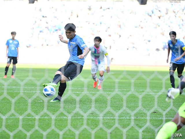 立ち上がりから一進一退の攻防となった試合が動いたのは前半も終わろうかという44分のことでした。クロスボールからの混戦で川崎FのFW五木田季晋選手(#9)が倒され、これがPKに。DF松長根悠仁選手(#3)がこのPKを冷静に決めて試合を動かします。