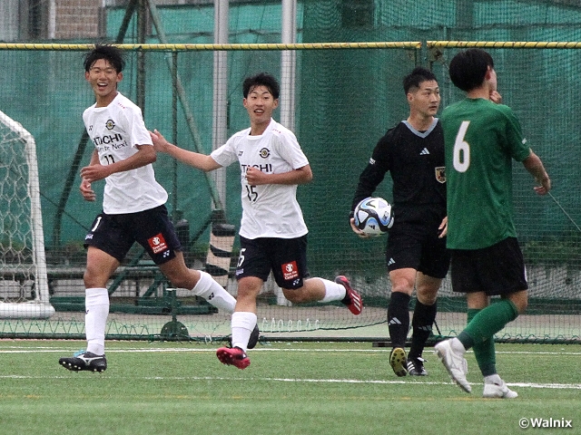 23分にはその土谷選手のクロスボールからFW小田晄平選手(#9)が頭で合わせて先制点を奪います。小田選手はFC東京U-18(東京)と引き分けた開幕戦に続く2試合連続のゴールでした。