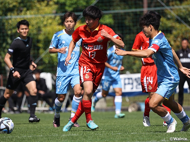 勝ち点5差で首位を追う3位の名古屋グランパスU-18(愛知)はアウェイで横浜FCと対戦します。開幕3連勝と好調な滑り出しとなった名古屋ですが、第4節以降は1勝3分け2敗と黒星が先行。しかし、敗れた2敗はいずれも1点差と僅差のゲームを展開し続けています。前節は攻撃陣が好調だった神戸とスコアレスドローで勝ち点1を積み上げました。首位との差を詰めるためには勝ち点3がほしいところです。対する横浜FCはEASTからWESTに戦いの場を移した今シーズンは厳しい戦いが続いています。ここまで勝利は第3節の東福岡戦のみですが、苦しい中でも引き分けで勝ち点を少しずつ積み上げています。直近2試合もジュビロ磐田U-18(静岡)に終盤で追い付き3-3、前節は神村学園に追い付かれ2-2で引き分けています。順位はプリンスリーグ降格圏の11位ですが、9位の鳥栖、10位の履正社との勝ち点差は2。残留圏浮上のために上位チームから勝ち点奪取を狙います。