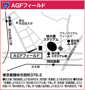 ●西武線「多磨駅」より京王バス「味の素スタジアム南」下車。JR・西武線「武蔵境駅」より小田急バス「萩の原住宅」下車。JR「武蔵小金井駅」より京王バス「萩の原住宅」下車