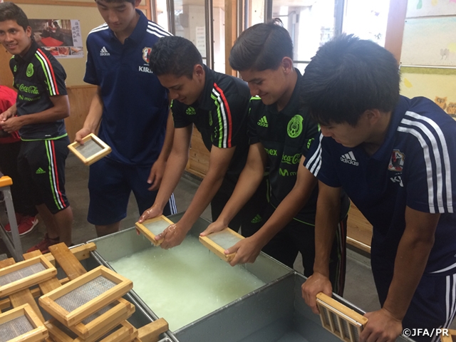 全チームの選手とスタッフが混ざり合ってバスに乗り込み、一行は日本文化の体験に向かいます。大会の開催地である鳥取地方に古くから伝わる「因州和紙」を用いた和紙の紙すきと書道を選手たちは体験。日本独自のものづくりに初めて触れる選手たちは、初めは要領をつかむまで苦労している様子でしたが、日本の選手たちがフォローをしながら、それぞれ個性溢れる作品を創りだしていました。選手たちは積極的にコミュニケーションを図り、思い出を写真に収める姿が随所に見られ、オフザピッチで国を越えた友情を深めました。