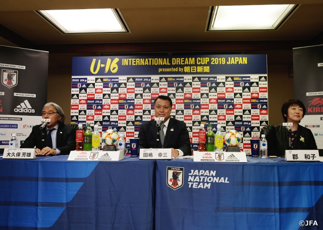 2015年に創設された本大会は今年で5回目となり、今年はルーマニア、ナイジェリア、メキシコの4カ国が頂点をかけて戦います。仙台市での開催は3年連続となることに、JFA田嶋会長は改めて感謝の意を表するとともに、大会の開幕前の9日(日)にはひとめぼれスタジアム宮城でキリンチャレンジカップ2019が行われることから、「選手たちは日本代表として活躍する未来の自分をイメージしながら、このU-16インターナショナルドリームカップをプレーするだろう」と期待を寄せました。