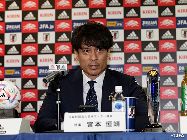 宮本恒靖JFA理事は「仙台カップという大会が過去に行われていて、そこでも少し前の日本代表を支える選手が輩出され、この大会も3回仙台で開催してもらいました。市長とお話していても、ベガルタ仙台の試合に来ても、サッカーがしっかり根付いた土壌だと感じます。若い選手たちにとって、たくさんの人に見てもらうことで成長の機会につなげてほしいです」と仙台市で大会が行われる意義を語りました。