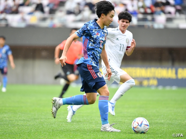 韓国戦で決定機を外してしまい悔しい思いをしたので、チャンスは死ぬ気でつかむ思いでした。前半からボールを保持できない時にメキシコペースになってしまいましたが、失点ゼロで終えられたのが後半につながりました。先制点のアシストは、(杉浦)駿吾選手が自分の武器であるハードワークしてオーバーラップするのを分かってパスを出してくれて、佐藤(龍之介)選手がクロスを上げたいところに入ってくれて、決めてくれました。感謝しています。