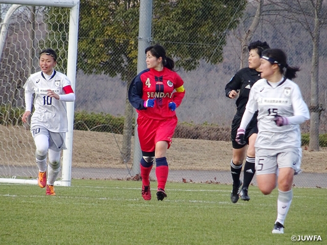 相手DFの背後にシンプルにボールを蹴りこみ、前への推進力を高める明治国際医療大学に対し、仙台大学は勝又美沙希選手、行田瑠衣選手を中心にボールをしっかりと弾き、セカンドボールを岡部唯花選手が拾い、相手にペースを与えません。