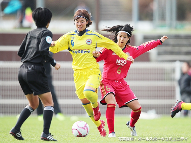 二度目の出場となる追手門学院大学(関西第4代表)と4年連続4回目の出場となる八戸学院大学(東北第2代表)との一戦。立ち上がりはコンパクトに陣形を保ちながらプレスをかける八戸学院大に対し、坂田絵里選手を中心としたスピードのあるアタッカーがタイミングよくディフェンス背後のスペースをつく追手門学院大。その攻撃が実り、坂田選手が9分にスルーパスから冷静にゴールに流し込み、追手門学院大が先制します。そのまま攻勢が続くと思われましたが、徐々に追手門学院大の攻撃に慣れた八戸学院大が落ち着きを取り戻し、CKからの混戦のこぼれ球を成田愛選手が決めて同点で前半を終了します。後半立ち上がり、シンプルな攻撃で追手門学院大を押し込んだ八戸学院大が、左サイドでFKを得ます。高畠早奈恵選手がヘディングを叩き込んで逆転し、その後は一進一退の攻防が続きます。そして後半中盤以降になっても運動量が落ちない追手門学院大が、八戸学院大の浅くなったディフェンスラインの一瞬の隙をつき、途中出場の伊禮彩音選が61分に中央から抜け出しシュートを決め同点に追いつきます。さらに畳み掛けるように、CKで佐々木彩選手のヘディングシュートの混戦から吉岡摩衣城選手が得点を挙げます。その後は必死に攻撃に出る八戸学院大をうまくコントロールした追手門学院大が逃げ切り、2回戦に進出しました。