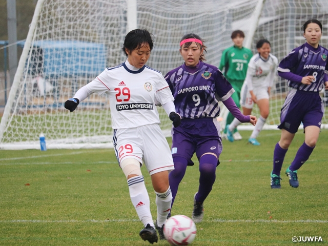 1回戦を突破し、勢いに乗る8年連続8回目出場の札幌大学(北海道代表)と、4年連続4回目の出場となる東洋大学(関東第4代表)との一戦。立ち上がりから硬いブロックを敷き、守備意識の高い札幌大学に対し、幅広くピッチを使い、丁寧にボールを動かしゴールを目指す東洋大学。スペースを消しながらサイドにボールを追い込み粘り強く守る札幌大学に対して、東洋大学の攻撃が実ったのは40分。ゴール前の混戦から大島彩香選手が蹴り込み東洋大学が先制します。その後も札幌大学は守備陣形を崩さず、1点差をキープしたまま前半を終了します。後半立ち上がり、東洋大学は前への圧力を強め、後半開始早々の48分、出耒村亜美選手のクロスから大内梨央選手がヘディングシュートを決めて2点差に広げます。この得点で落ち着きを取り戻した東洋大学は、焦ることなくボールを左右に散らして相手を揺さぶり、徐々に札幌大学の走力を奪います。69分には、再び大内選手がグラウンダーのクロスをワンタッチで流し込み、3点目を奪います。札幌大学はゴールを奪うために前へ出て何度か東洋のゴールを脅かしますが、79分、鈴木陽奈選手のミドルシュートが札幌DFに当たってコースが変わり4点目。最後まで果敢にゴールを奪おうと必死に粘る札幌大でしたが、終了間際に東洋大学の出耒村亜美選手、北川愛莉選手が追加点を挙げます。個々の力を見せつけた東洋大が快勝し、準々決勝に進出しました。
