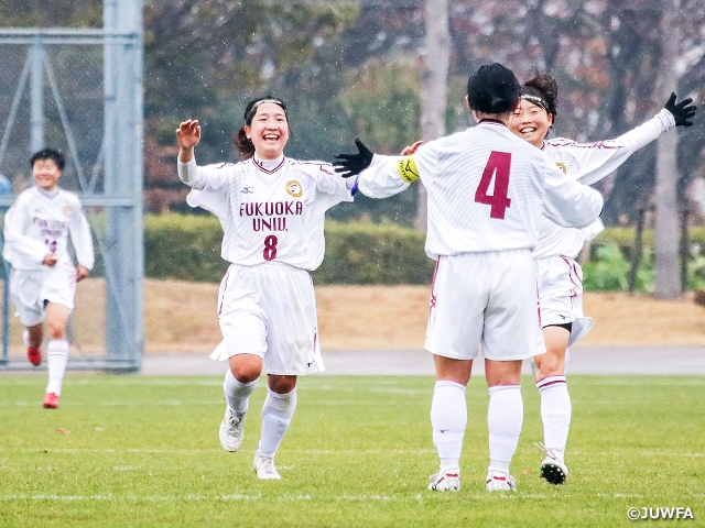 九州第1代表で、古豪復活を目指す福岡大学と、創部2年目から6年連続出場となる東北第2代表の八戸学院大学との一戦。前線にターゲットを置き、そこを起点に両ワイドを広く使って攻める福岡大学に対し、八戸学院大学はバランスよくショートパスと個人技を主体に攻める展開となりました。立ち上がりからロングボールを有効に使った福岡大学が14分、サイドにボールを展開。古庄恵実選手が見事なドリブルで切り込みクロスをあげると、原田優選手が見事に合わせて先制点を挙げます。その後も優位に試合を進める福岡大は、CKのこぼれ球を古庄選手がペナルティエリア外から豪快に蹴り込み、追加点を得ます。しかし八戸学院大も前半アディショナルタイムに佐藤悠乃選手が豪快なシュートを放ちます。バウンドしたボールがGKの頭を越えてゴール。福岡大リードの2-1で前半を折り返します。後半流れに乗りたい八戸学院大でしたが、福岡大が押し込む展開が続きます。52分に冨田選手、58分に安藤選手が立て続けに追加点を挙げて八戸学院大を突き放します。時間とともに受け身となった八戸学院大の足が徐々に止まりはじめ、福岡は70分に西山陽菜選手、77分には再び冨田選手がゴールを決めて試合を決定づけます。最後まで攻撃の手を緩めなかった福岡大学が6-1の勝利を収め、2回戦進出を決めました。