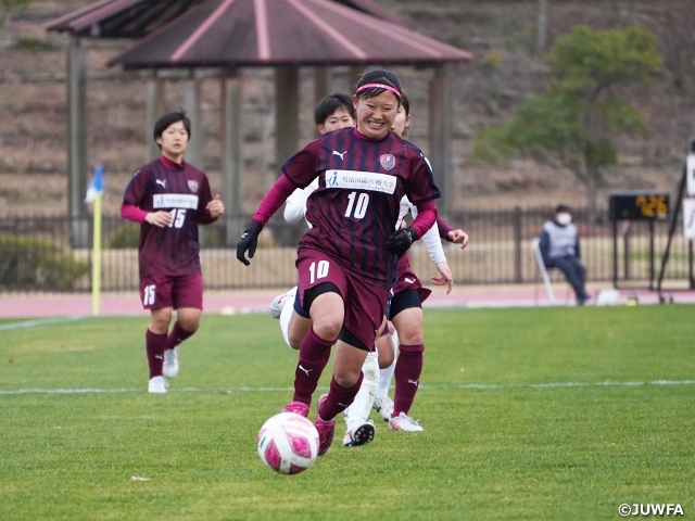 キックオフから明治国際医療大学(関西第2代表)が主導権を握り、両サイド選手のスピードを生かしチャンスを作りますが、八戸学院大学(東北第1代表)の堅守を前に得点には結びつきません。それでも12分、左サイドから中央の岡百々花選手にボールが渡り、落としに素早く反応した溝上可夏選手がシュート。キーパーの頭上を破り、明治国際医療大学が先制します。17分、27分には岡選手が連続ゴール。32分には古賀向日葵選手がゴールし、明治国際医療大学が4点リードで前半を折り返します。